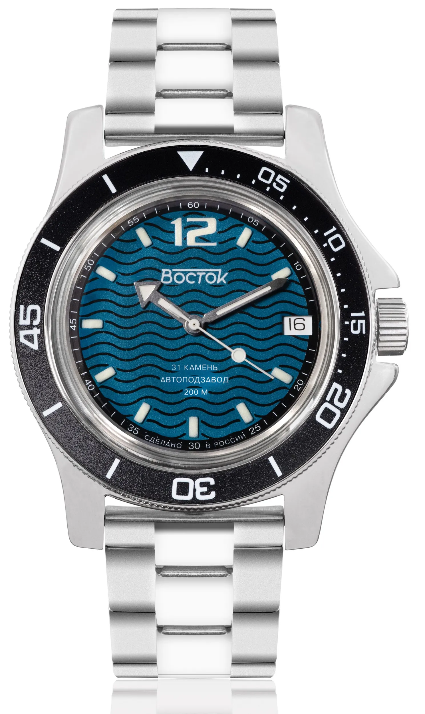 Мужские наручные часы Восток Амфибия 13040А. Механические с ручным подзаводом. Ремешок изготовлен из кожи. Браслет из нержавеющей стали. Органическое стекло. На циферблате отображается текущее число месяца. Часы являются водонепроницаемыми до 20 Бар. Цвет циферблата: Серебристый. Цвет циферблата: Черный. Цвет корпуса: Синий. На стрелки и отметки нанесен светонакопительный состав, благодаря этому считывать информацию с циферблата возможно и в темноте. Толщина: 13 мм. Гарантия: 1 год.