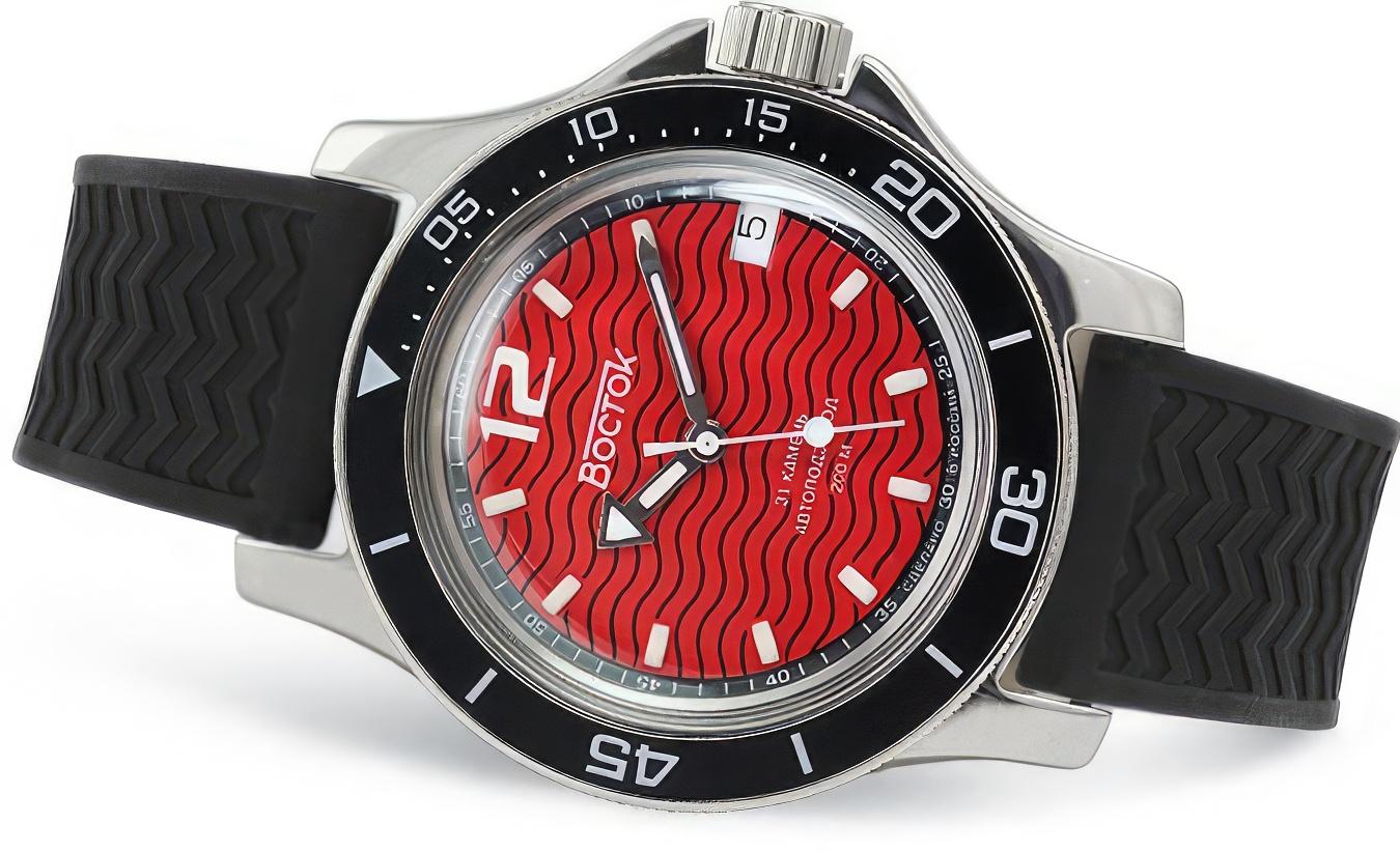 Мужские наручные часы Восток Амфибия 13043A. Механические с ручным подзаводом. Полимерный ремешок. Натуральный полимерный материал является идеальным для изготовления ремешка благодаря своей чрезвычайной прочности и гибкости. Браслет из нержавеющей стали. Органическое стекло. На циферблате отображается текущее число месяца. Часы являются водонепроницаемыми до 20 Бар. Цвет циферблата: Серебристый. Цвет циферблата: Черный. Цвет корпуса: Красный. На стрелки и отметки нанесен светонакопительный состав, благодаря этому считывать информацию с циферблата возможно и в темноте. Толщина: 13 мм. Гарантия: 1 год.