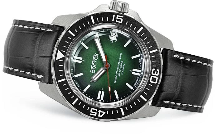 Мужские часы Восток Амфибия 14049Б. Механические с ручным подзаводом. Корпус изготовлен из высококачественной нержавеющей стали 316L с высокими антикоррозийными свойствами. Ремешок изготовлен из кожи. Часы являются водонепроницаемыми до 20 Бар. Цвет корпуса: Черный. Цвет циферблата: Зеленый. Ширина (с заводной головкой): 44мм. Толщина: 15мм. Гарантия: 1 год.