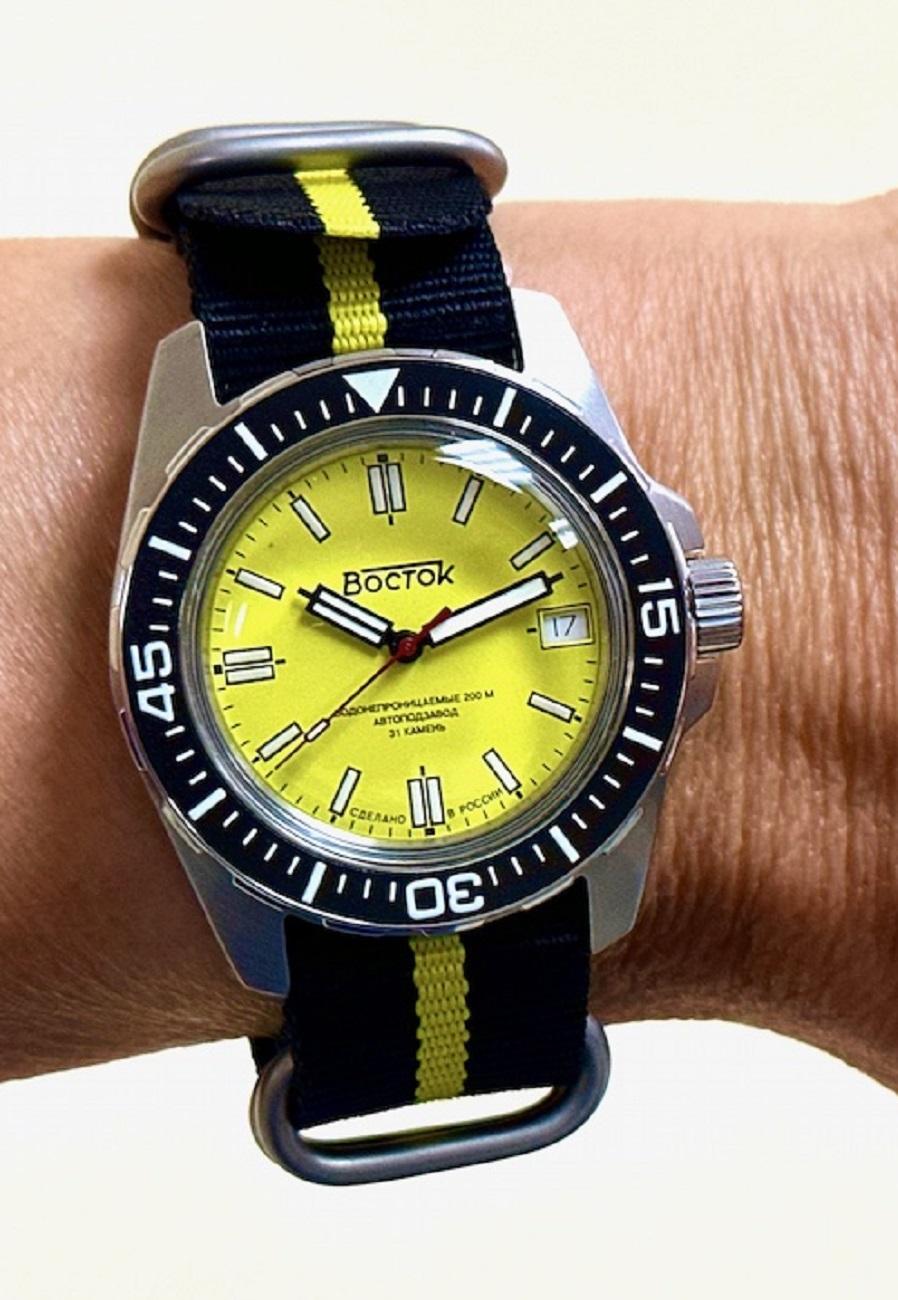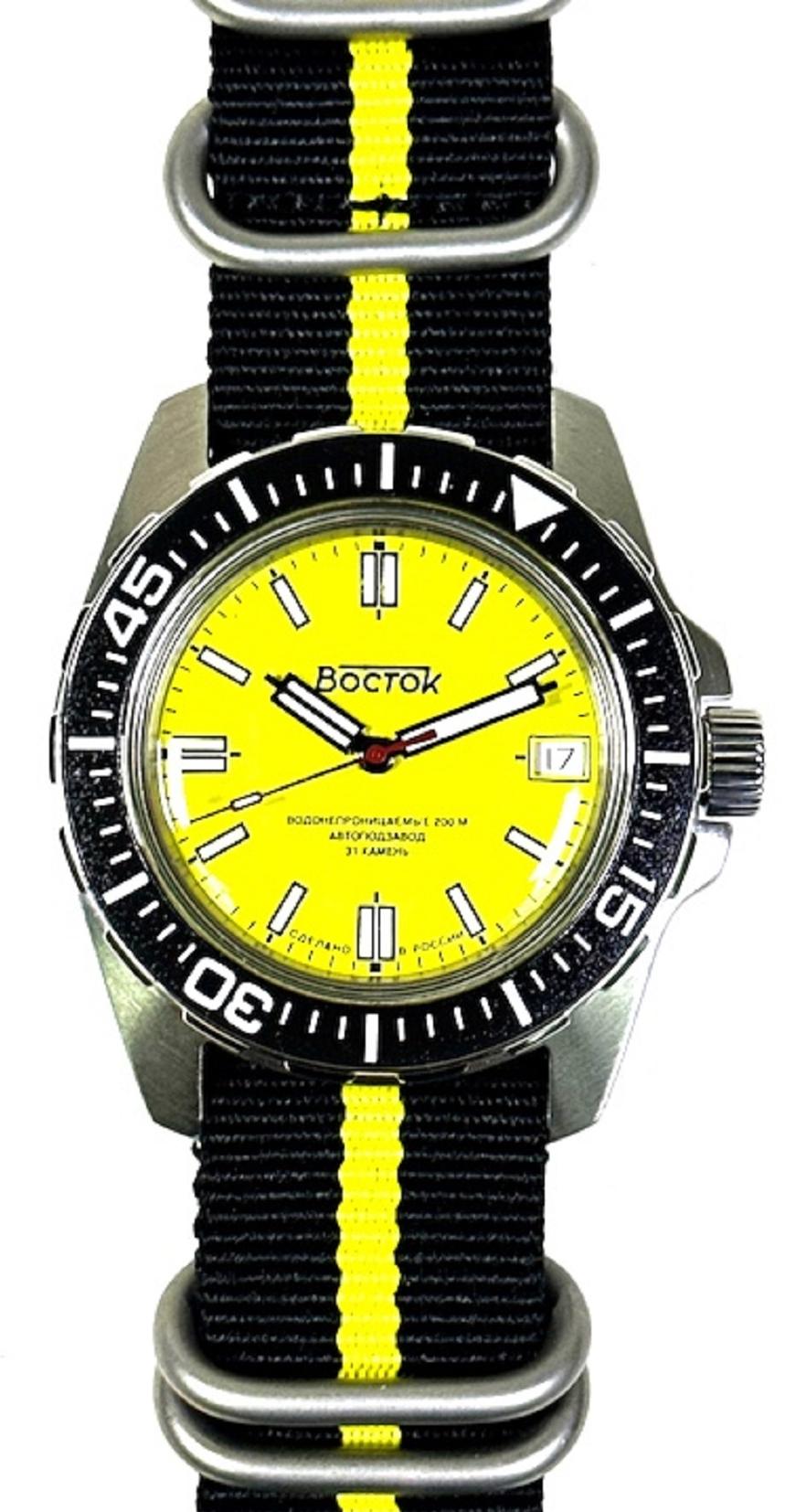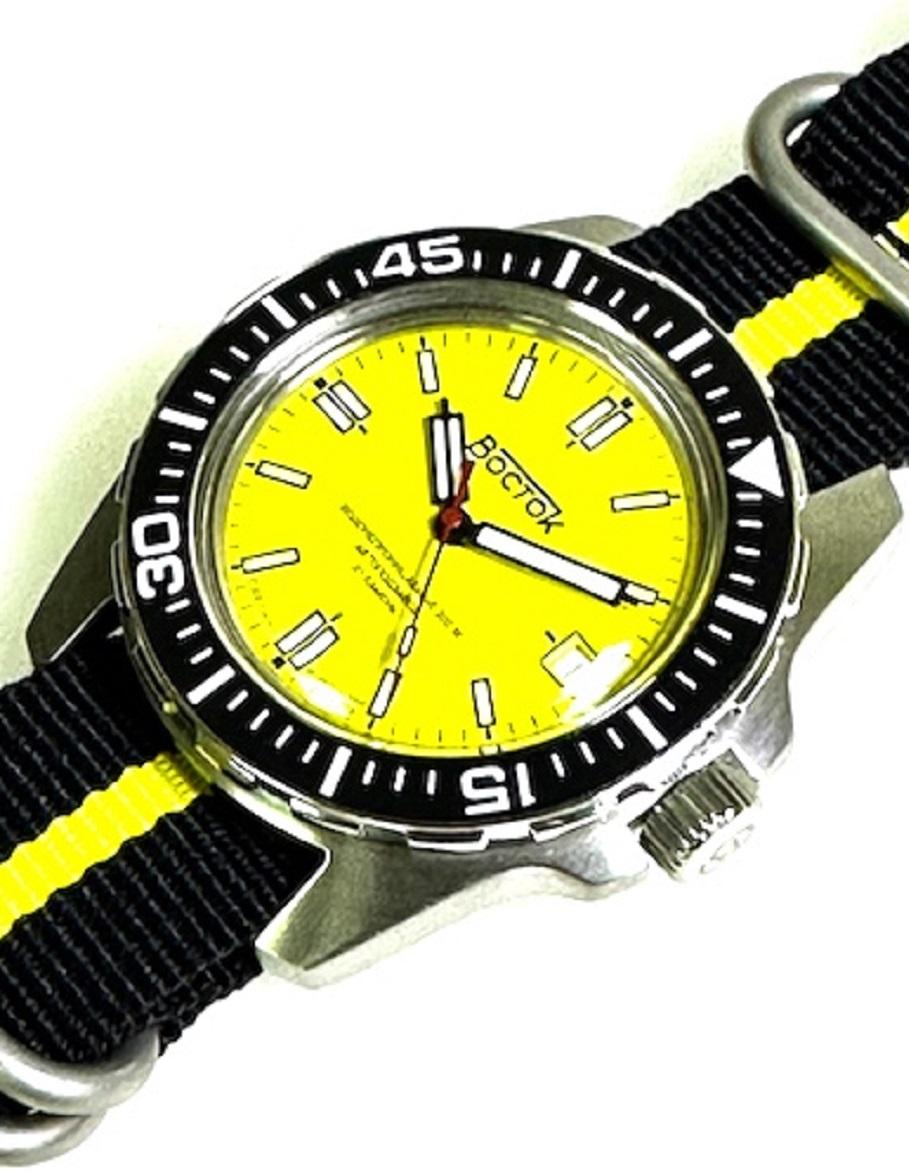 Мужские наручные часы Восток Амфибия 14050Б. Механические с ручным подзаводом. Текстильный ремешок. Аккумулятор обеспечивает часы достаточным питанием приблизительно на 10 лет. Браслет из нержавеющей стали. Органическое стекло. На циферблате отображается текущее число месяца. Часы являются водонепроницаемыми до 20 Бар. Цвет циферблата: Черный. Цвет корпуса: Желтый. На стрелки и отметки нанесен светонакопительный состав, благодаря этому считывать информацию с циферблата возможно и в темноте. Высота (с ушками): 46 мм. Толщина: 15 мм. Гарантия: 1 год.