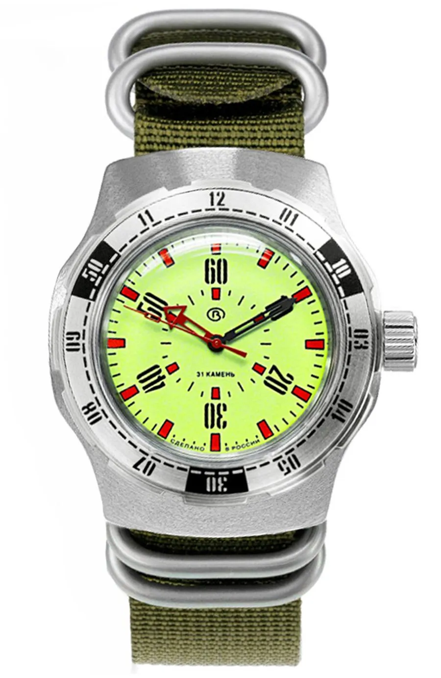 Мужские наручные часы Восток Амфибия 16032В-1. Механические с ручным подзаводом. Корпус изготовлен из высококачественной нержавеющей стали 316L с высокими антикоррозийными свойствами. На стрелки и отметки нанесен светонакопительный состав, благодаря этому считывать информацию с циферблата возможно и в темноте. Ударопрочность. Батарейка на 10 летТекстильный ремешок. Органическое стекло. Часы являются водонепроницаемыми до 20 Бар. Цвет корпуса: Серебристый. Цвет циферблата: Желтый. Ширина (с заводной головкой): 42мм. Толщина: 15мм. Гарантия: 1 год.
