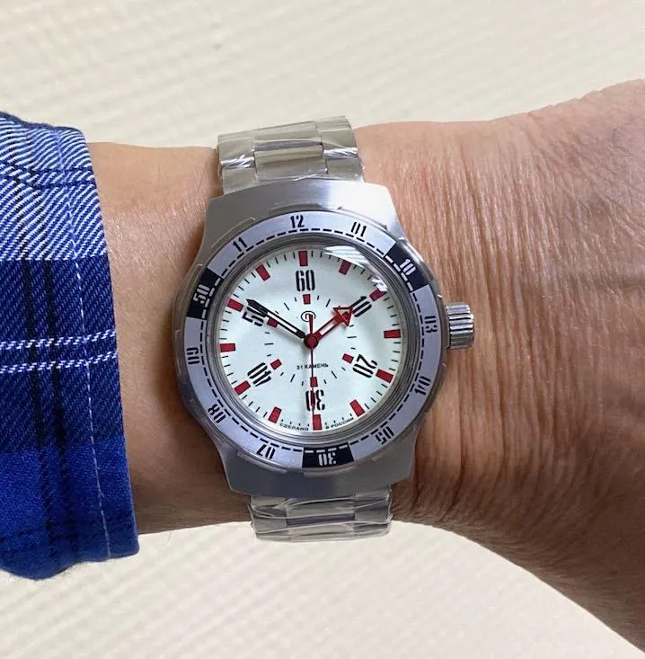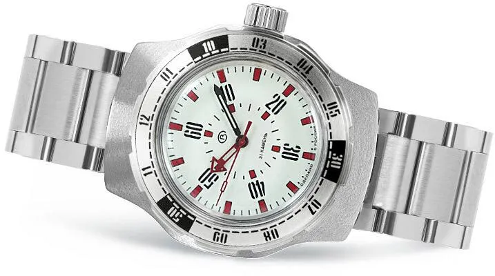 Мужские наручные часы Восток Амфибия 16089А. Механические с ручным подзаводом. Корпус изготовлен из высококачественной нержавеющей стали 316L с высокими антикоррозийными свойствами. На стрелки и отметки нанесен светонакопительный состав, благодаря этому считывать информацию с циферблата возможно и в темноте. Браслет из нержавеющей стали. Органическое стекло. Часы являются водонепроницаемыми до 20 Бар. Цвет корпуса: Серебристый. Цвет циферблата: Белый. Ширина (с заводной головкой): 44мм. Толщина: 14мм. Гарантия: 1 год.