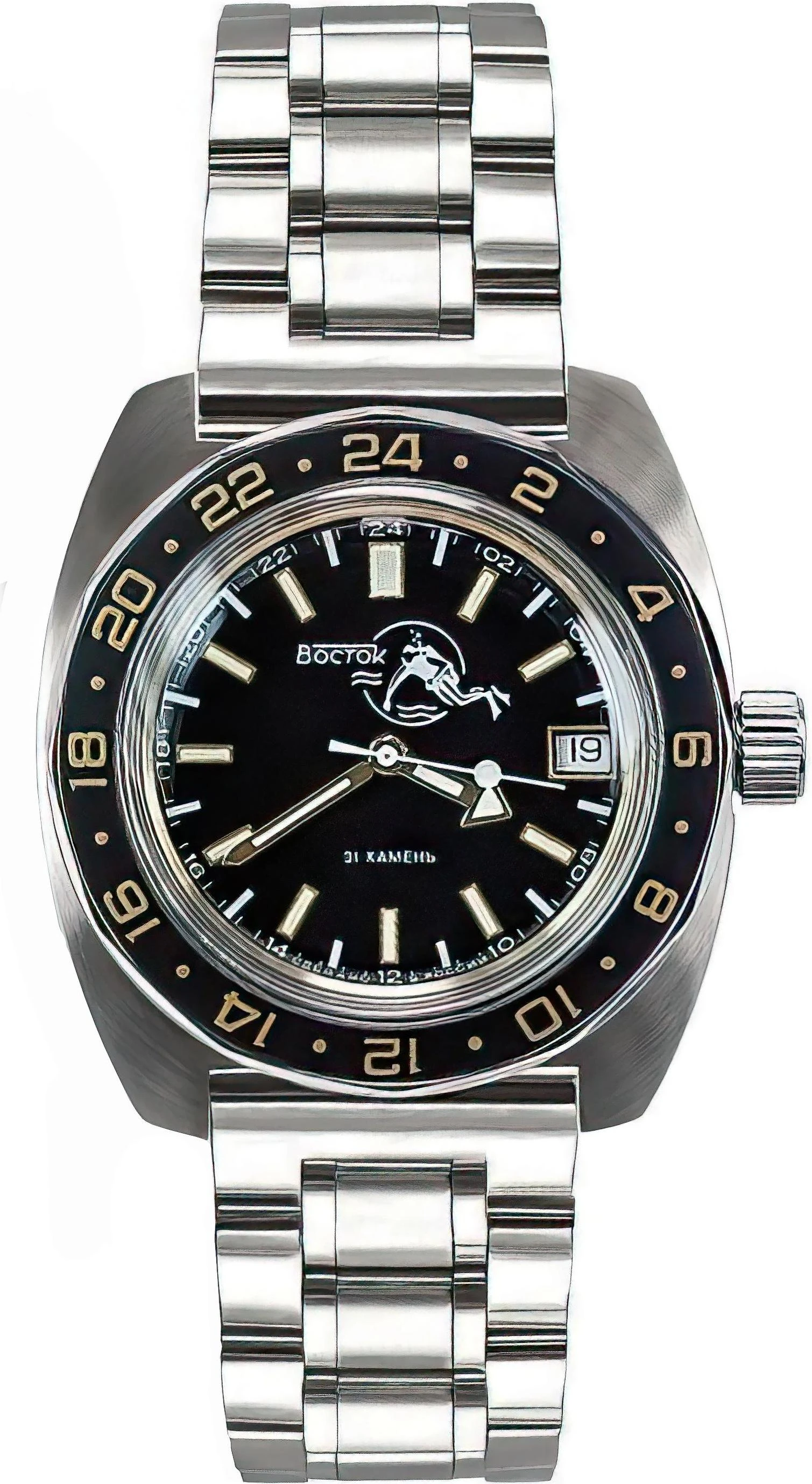 Мужские наручные часы Восток Амфибия 17005Б. Механические с ручным подзаводом. Браслет из нержавеющей стали. Браслет из нержавеющей стали. Органическое стекло. На циферблате отображается текущее число месяца. Часы являются водонепроницаемыми до 20 Бар. Цвет циферблата: Серебристый. Цвет циферблата: Черный. Цвет корпуса: Черный. На стрелки и отметки нанесен светонакопительный состав, благодаря этому считывать информацию с циферблата возможно и в темноте. Толщина: 14 мм. Гарантия: 1 год.