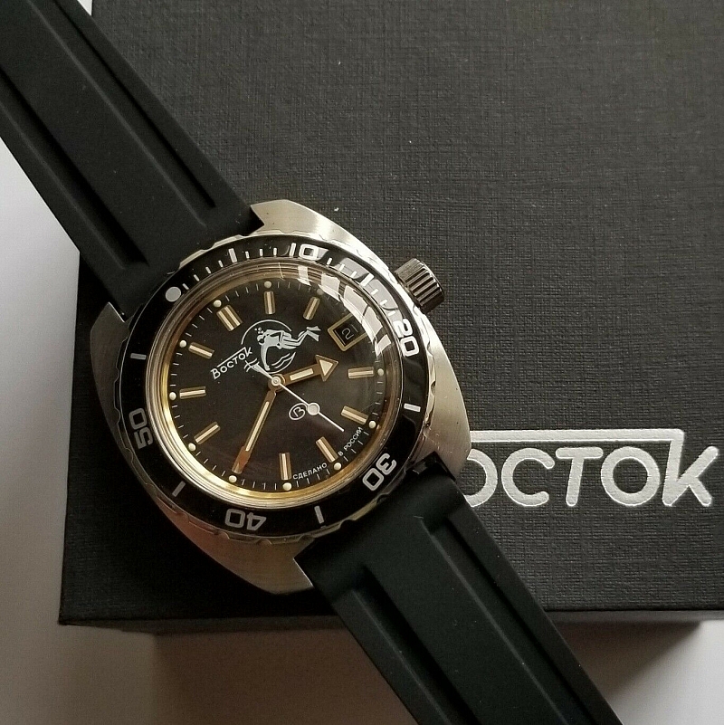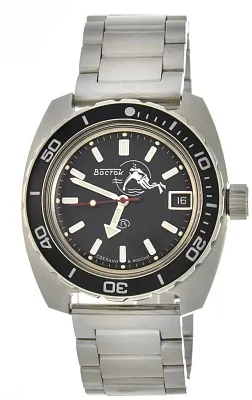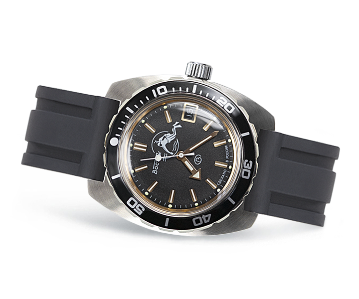 Мужские наручные часы Восток Амфибия 170805. Механические с ручным подзаводом. Корпус изготовлен из высококачественной нержавеющей стали 316L с высокими антикоррозийными свойствами. На стрелки и отметки нанесен светонакопительный состав, благодаря этому считывать информацию с циферблата возможно и в темноте. На циферблате отображается текущее число месяца. Ударопрочная конструкция часов защищает от ударов и вибрации. Полимерный ремешок. Натуральный полимерный материал является идеальным для изготовления ремешка благодаря своей чрезвычайной прочности и гибкости. Органическое стекло. Часы являются водонепроницаемыми до 20 Бар. Цвет корпуса: Черный. Цвет циферблата: Черный. Гарантия: 1 год.