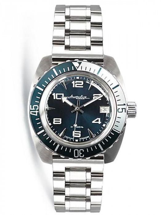 Мужские наручные часы Восток Амфибия 170894. Автоматические с ручным подзаводом. Пружина механизма заводится автоматически благодаря естественным движениям владельца в процессе ежедневной носки часов. Также есть возможность ручного завода. Корпус изготовлен из высококачественной нержавеющей стали 316L с высокими антикоррозийными свойствами. На стрелки и отметки нанесен светонакопительный состав, благодаря этому считывать информацию с циферблата возможно и в темноте. На циферблате отображается текущее число месяца. Ударопрочная конструкция часов защищает от ударов и вибрации. Браслет из нержавеющей стали. Органическое стекло. Часы являются водонепроницаемыми до 20 Бар. Цвет корпуса: Серебристый. Цвет циферблата: Синий. Гарантия: 1 год.