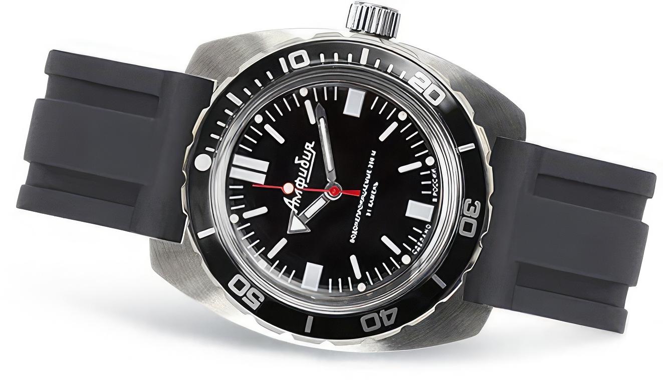 Мужские наручные часы Восток Амфибия 170916. Механические с ручным подзаводом. Полимерный ремешок. Натуральный полимерный материал является идеальным для изготовления ремешка благодаря своей чрезвычайной прочности и гибкости. Браслет из нержавеющей стали. Органическое стекло. Часы являются водонепроницаемыми до 20 Бар. Цвет циферблата: Серебристый. Цвет корпуса: Черный. Толщина: 15 мм. Гарантия: 1 год.