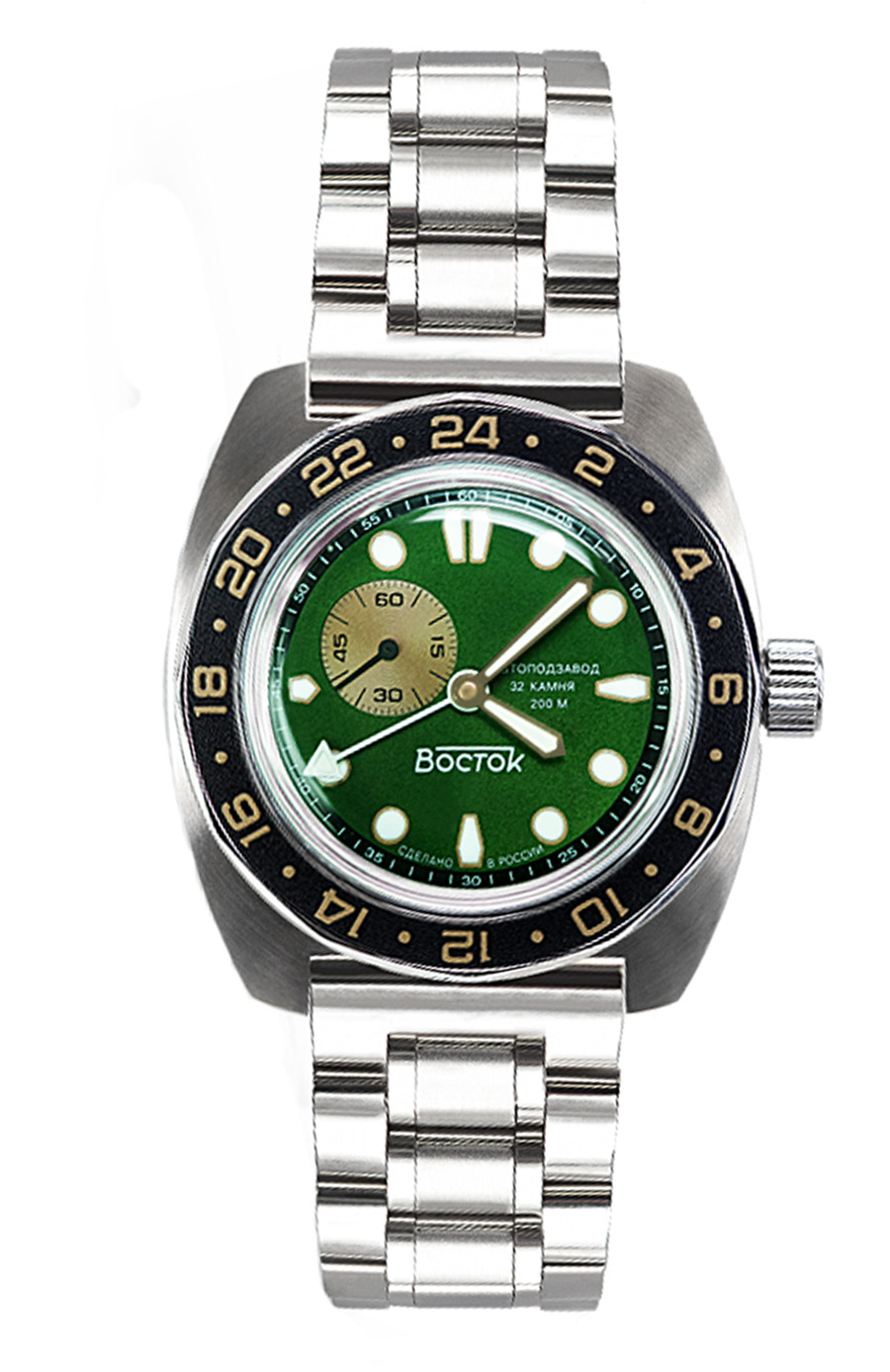 Мужские наручные часы Восток Амфибия 17099Б. Механические с ручным подзаводом. Браслет из нержавеющей стали. Ударопрочная конструкция часов защищает от ударов и вибрации. Аккумулятор обеспечивает часы достаточным питанием приблизительно на 10 лет. Браслет из нержавеющей стали. Органическое стекло. Часы являются водонепроницаемыми до 20 Бар. Цвет циферблата: Черный. Цвет корпуса: Зеленый. На стрелки и отметки нанесен светонакопительный состав, благодаря этому считывать информацию с циферблата возможно и в темноте. Высота (с ушками): 46 мм. Толщина: 15 мм. Гарантия: 1 год.