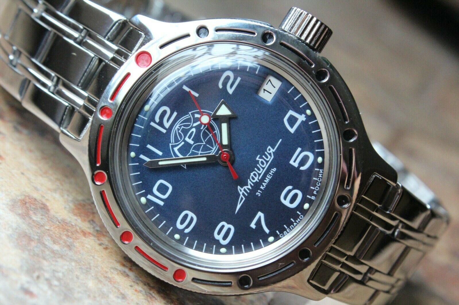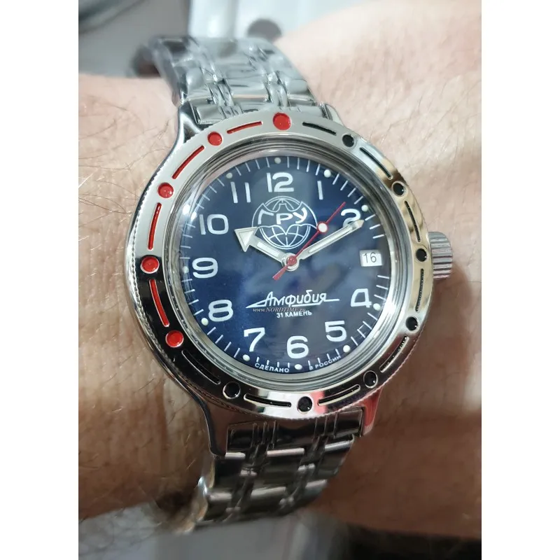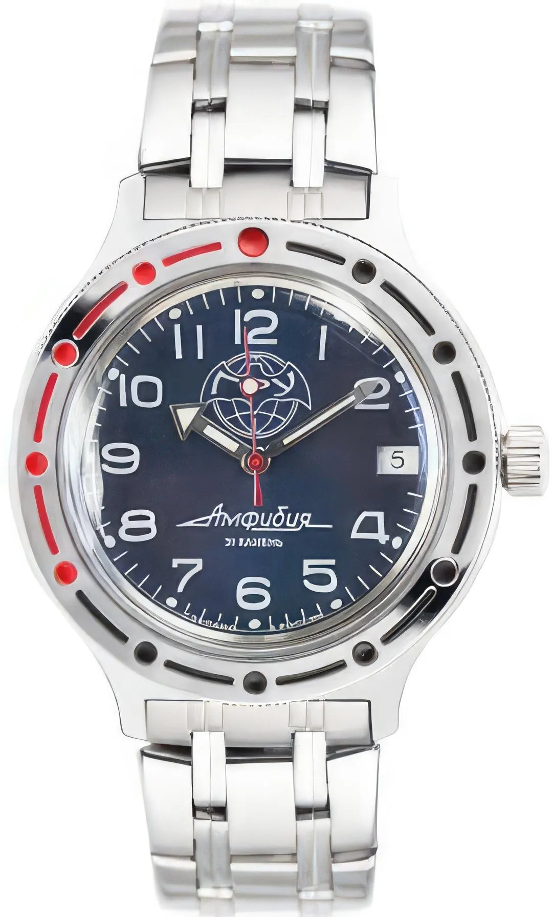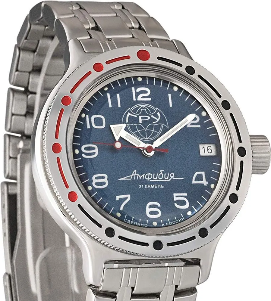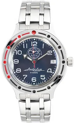 Мужские наручные часы Восток Амфибия 420866. Механические с автоподзаводом. Пружина механизма заводится автоматически благодаря естественным движениям владельца в процессе ежедневной носки часов. Корпус изготовлен из высококачественной нержавеющей стали 316L с высокими антикоррозийными свойствами. На стрелки и отметки нанесен светонакопительный состав, благодаря этому считывать информацию с циферблата возможно и в темноте. На циферблате отображается текущее число месяца. Браслет из нержавеющей стали. Органическое стекло. Часы являются водонепроницаемыми до 20 Бар. Цвет корпуса: Серебристый. Цвет циферблата: Синий. Ширина (с заводной головкой): 39мм. Толщина: 15мм. Гарантия: 1 год.