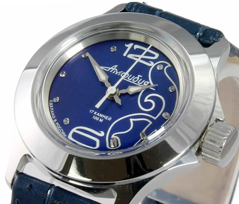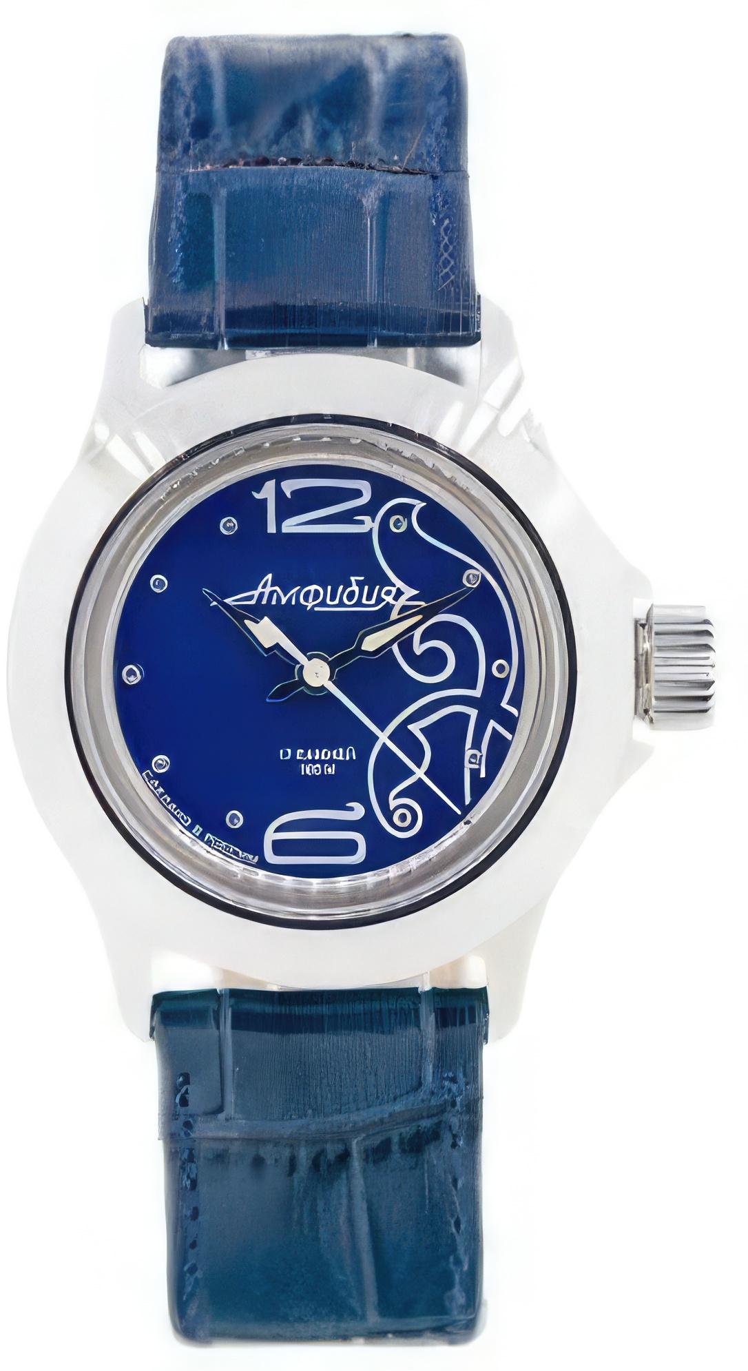 Женские наручные часы Восток Амфибия 051340. Механические с автоподзаводом. Пружина механизма заводится автоматически благодаря естественным движениям владельца в процессе ежедневной носки часов. Корпус изготовлен из высококачественной нержавеющей стали 316L с высокими антикоррозийными свойствами. На стрелки и отметки нанесен светонакопительный состав, благодаря этому считывать информацию с циферблата возможно и в темноте. Ремешок изготовлен из кожи. Органическое стекло. Часы являются водонепроницаемыми до 10 Бар. Цвет корпуса: Белый. Цвет циферблата: Синий. Ширина (с заводной головкой): 33мм. Толщина: 11мм. Гарантия: 1 год.