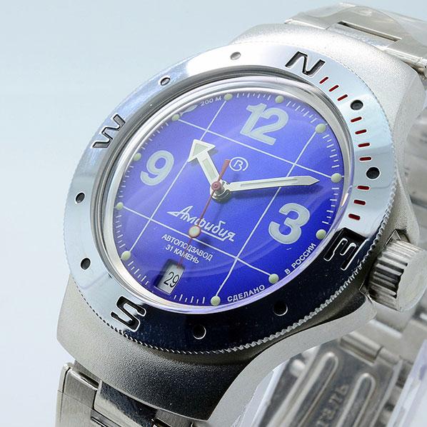 Мужские наручные часы Восток Амфибия 060116. Механические с автоподзаводом. Пружина механизма заводится автоматически благодаря естественным движениям владельца в процессе ежедневной носки часов. Корпус изготовлен из высококачественной нержавеющей стали 316L с высокими антикоррозийными свойствами. На стрелки и отметки нанесен светонакопительный состав, благодаря этому считывать информацию с циферблата возможно и в темноте. На циферблате отображается текущее число месяца. Браслет из нержавеющей стали. Прочное, устойчивое к царапинам минеральное стекло защищает часы от повреждений. Часы являются водонепроницаемыми до 20 Бар. Цвет корпуса: Двухцветный. Цвет циферблата: Синий. Ширина (с заводной головкой): 42мм. Толщина: 13мм. Гарантия: 1 год.
