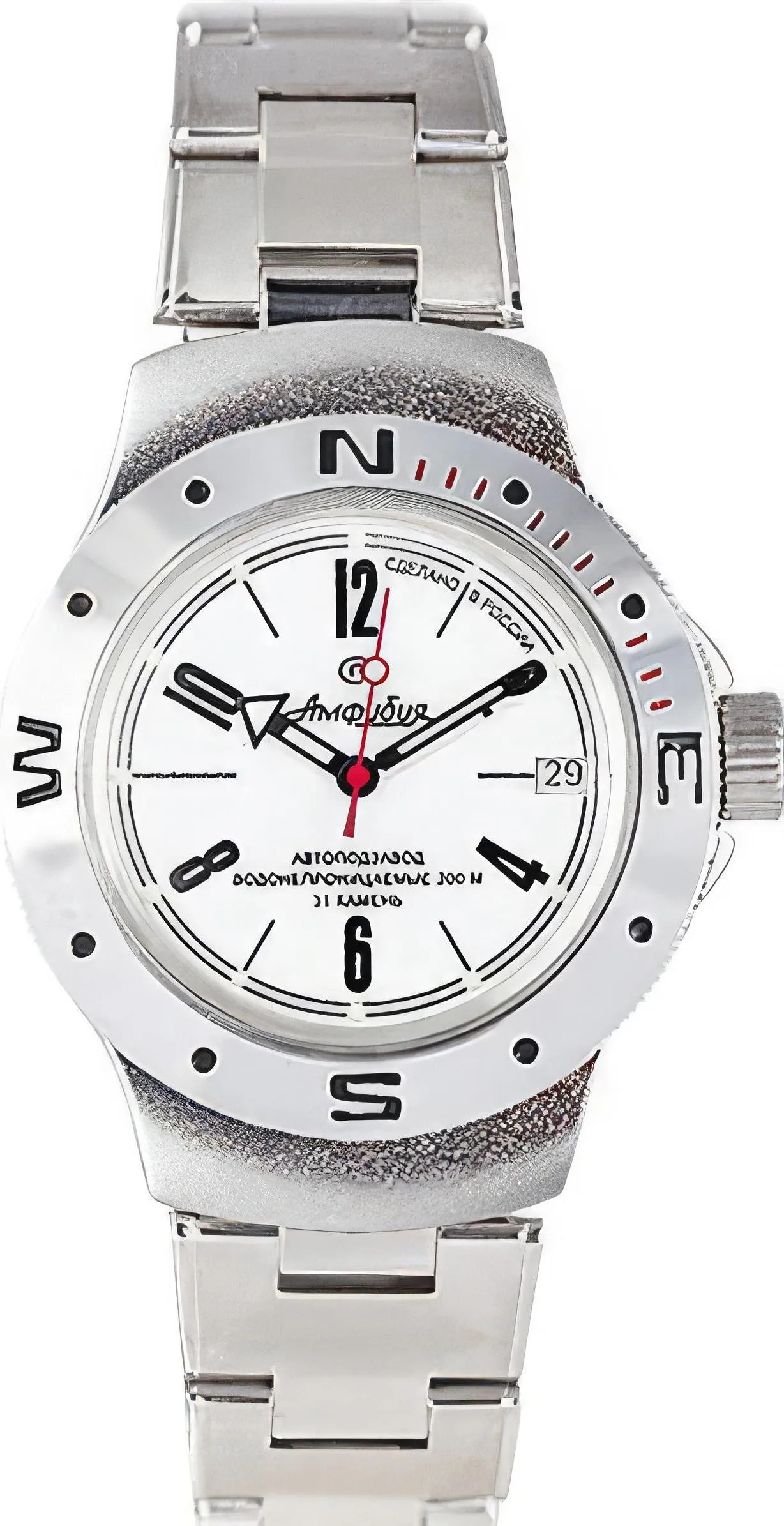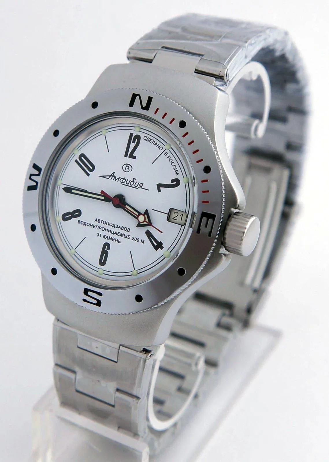 Мужские наручные часы Восток Амфибия 060483. Механические с автоподзаводом. Пружина механизма заводится автоматически благодаря естественным движениям владельца в процессе ежедневной носки часов. Корпус изготовлен из высококачественной нержавеющей стали 316L с высокими антикоррозийными свойствами. На стрелки и отметки нанесен светонакопительный состав, благодаря этому считывать информацию с циферблата возможно и в темноте. На циферблате отображается текущее число месяца. Браслет из нержавеющей стали. Органическое стекло. Часы являются водонепроницаемыми до 20 Бар. Цвет корпуса: Двухцветный. Цвет циферблата: Белый. Ширина (с заводной головкой): 42мм. Толщина: 13мм. Гарантия: 1 год.