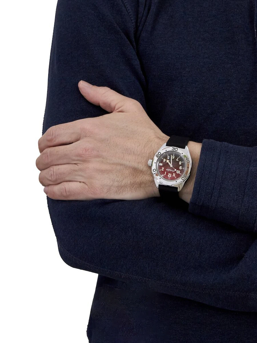 Мужские наручные часы Восток Амфибия 67069Б. Механические с ручным подзаводом. Полимерный ремешок. Натуральный полимерный материал является идеальным для изготовления ремешка благодаря своей чрезвычайной прочности и гибкости. Ударопрочная конструкция часов защищает от ударов и вибрации. Браслет из нержавеющей стали. Органическое стекло. На циферблате отображается текущее число месяца. Часы являются водонепроницаемыми до 20 Бар. Цвет циферблата: Серебристый. Цвет корпуса: Красный. На стрелки и отметки нанесен светонакопительный состав, благодаря этому считывать информацию с циферблата возможно и в темноте. Высота (с ушками): 49 мм. Толщина: 15 мм. Гарантия: 1 год.