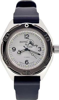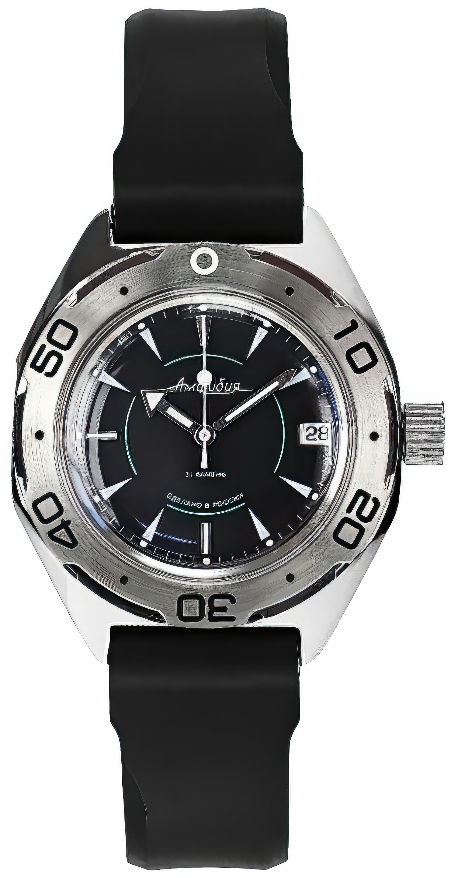 Мужские наручные часы Восток Амфибия 670923. Механические с автоподзаводом. Пружина механизма заводится автоматически благодаря естественным движениям владельца в процессе ежедневной носки часов. Корпус изготовлен из высококачественной нержавеющей стали 316L с высокими антикоррозийными свойствами. На стрелки и отметки нанесен светонакопительный состав, благодаря этому считывать информацию с циферблата возможно и в темноте. На циферблате отображается текущее число месяца. Полимерный ремешок. Натуральный полимерный материал является идеальным для изготовления ремешка благодаря своей чрезвычайной прочности и гибкости. Органическое стекло. Часы являются водонепроницаемыми до 20 Бар. Цвет корпуса: Черный. Цвет циферблата: Черный. Ширина (с заводной головкой): 40мм. Толщина: 10мм. Гарантия: 1 год.