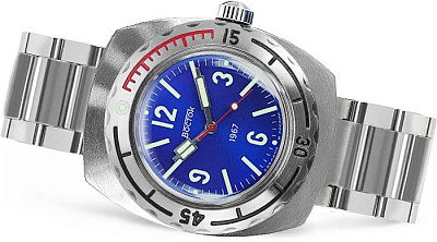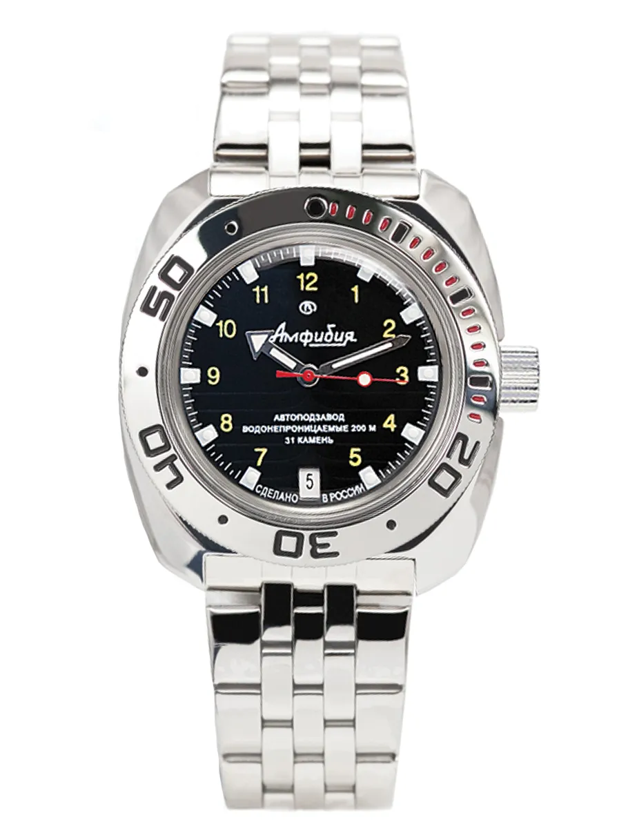 Мужские наручные часы Восток Амфибия 710270. Механические с ручным подзаводом. Браслет из нержавеющей стали. Браслет из нержавеющей стали. Органическое стекло. На циферблате отображается текущее число месяца. Часы являются водонепроницаемыми до 20 Бар. Цвет циферблата: Серебристый. Цвет корпуса: Черный. На стрелки и отметки нанесен светонакопительный состав, благодаря этому считывать информацию с циферблата возможно и в темноте. Высота (с ушками): 46 мм. Толщина: 15 мм. Гарантия: 1 год.
