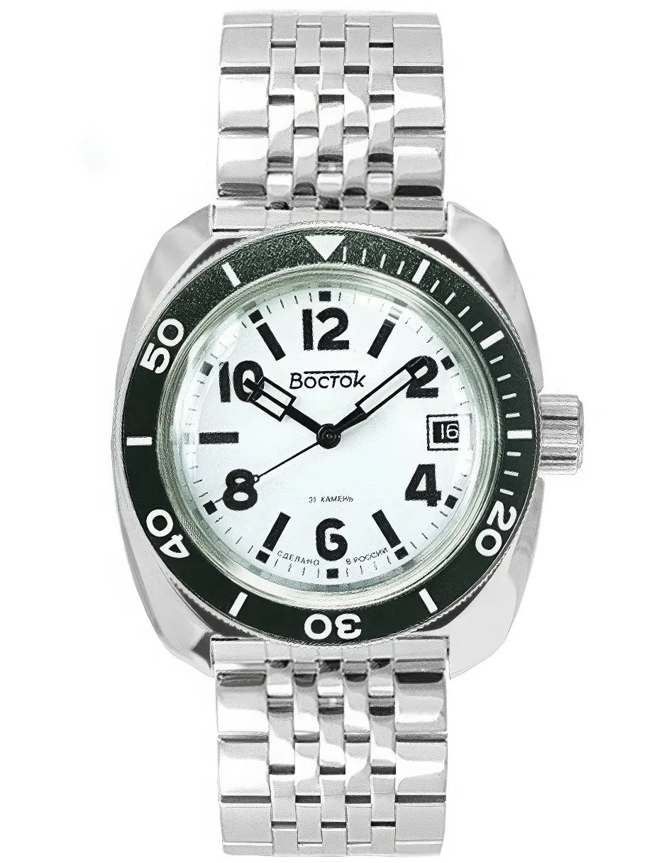 Мужские наручные часы Восток Амфибия 71049В. Механические с ручным подзаводом. Браслет из нержавеющей стали. Ударопрочная конструкция часов защищает от ударов и вибрации. Браслет из нержавеющей стали. Органическое стекло. На циферблате отображается текущее число месяца. Часы являются водонепроницаемыми до 20 Бар. Цвет циферблата: Черный. Цвет корпуса: Белый. На стрелки и отметки нанесен светонакопительный состав, благодаря этому считывать информацию с циферблата возможно и в темноте. Высота (с ушками): 46 мм. Толщина: 15 мм. Гарантия: 1 год.