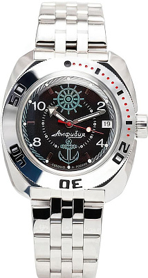 Мужские наручные часы Восток Амфибия 71052В. Механические с ручным подзаводом. Браслет из нержавеющей стали. Ударопрочная конструкция часов защищает от ударов и вибрации. Браслет из нержавеющей стали. Органическое стекло. На циферблате отображается текущее число месяца. Часы являются водонепроницаемыми до 20 Бар. Цвет циферблата: Черный. Цвет корпуса: Черный. На стрелки и отметки нанесен светонакопительный состав, благодаря этому считывать информацию с циферблата возможно и в темноте. Высота (с ушками): 46 мм. Толщина: 15 мм. Гарантия: 1 год.