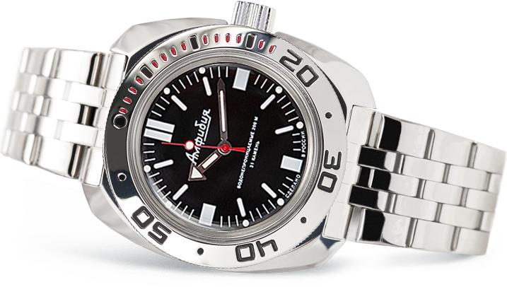 Мужские наручные часы Восток Амфибия 710916. Механические с ручным подзаводом. Браслет из нержавеющей стали. Браслет из нержавеющей стали. Органическое стекло. Часы являются водонепроницаемыми до 20 Бар. Цвет циферблата: Серебристый. Цвет корпуса: Черный. На стрелки и отметки нанесен светонакопительный состав, благодаря этому считывать информацию с циферблата возможно и в темноте. Толщина: 15 мм. Гарантия: 1 год.