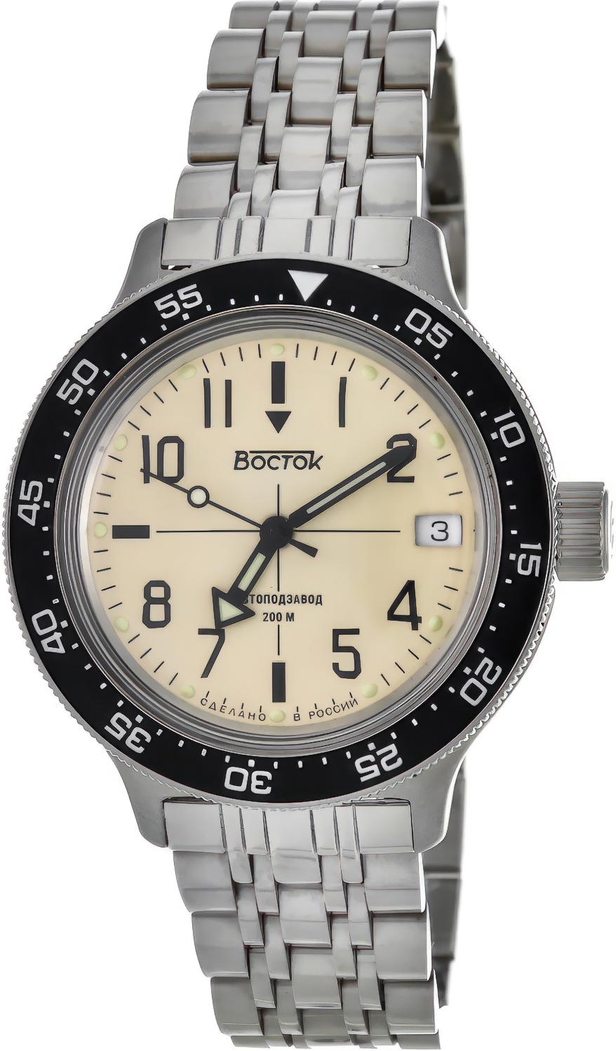 Мужские наручные часы Восток Амфибия 720070. Механические с ручным подзаводом. Браслет из нержавеющей стали. Браслет из нержавеющей стали. Органическое стекло. На циферблате отображается текущее число месяца. Часы являются водонепроницаемыми до 20 Бар. Цвет циферблата: Черный. Цвет корпуса: Бежевый. На стрелки и отметки нанесен светонакопительный состав, благодаря этому считывать информацию с циферблата возможно и в темноте. Толщина: 12 мм. Гарантия: 1 год.