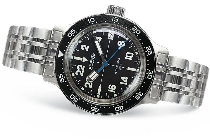 Мужские наручные часы Восток Амфибия 72015Б. Механические с ручным подзаводом. Корпус изготовлен из высококачественной нержавеющей стали 316L с высокими антикоррозийными свойствами. На стрелки и отметки нанесен светонакопительный состав, благодаря этому считывать информацию с циферблата возможно и в темноте. На циферблате отображается текущее число месяца. Браслет из нержавеющей стали. Органическое стекло. Часы являются водонепроницаемыми до 20 Бар. Цвет корпуса: Черный. Цвет циферблата: Черный. Ширина (с заводной головкой): 42мм. Толщина: 13мм. Гарантия: 1 год.