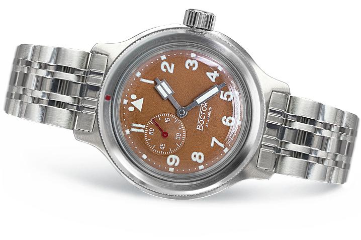 Мужские наручные часы Восток Амфибия 72093А. Механические с ручным подзаводом. Браслет из нержавеющей стали. Браслет из нержавеющей стали. Органическое стекло. Часы являются водонепроницаемыми до 20 Бар. Цвет циферблата: Серебристый. Цвет корпуса: Коричневый. На стрелки и отметки нанесен светонакопительный состав, благодаря этому считывать информацию с циферблата возможно и в темноте. Толщина: 13 мм. Гарантия: 1 год.