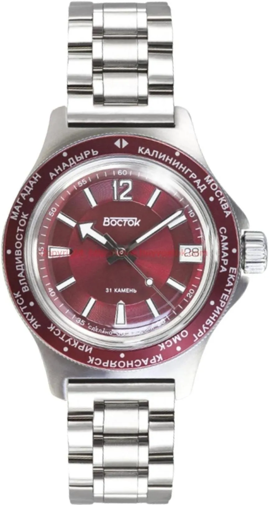 Мужские наручные часы Восток Амфибия 740016. Автоматические с ручным подзаводом. Пружина механизма заводится автоматически благодаря естественным движениям владельца в процессе ежедневной носки часов. Также есть возможность ручного завода. Браслет из нержавеющей стали. Ударопрочная конструкция часов защищает от ударов и вибрации. Браслет из нержавеющей стали. Органическое стекло. На циферблате отображается текущее число месяца. Часы являются водонепроницаемыми до 20 Бар. Цвет циферблата: Красный. Цвет циферблата: Серебристый. Цвет корпуса: Красный. На стрелки и отметки нанесен светонакопительный состав, благодаря этому считывать информацию с циферблата возможно и в темноте. Толщина: 13 мм. Гарантия: 1 год.