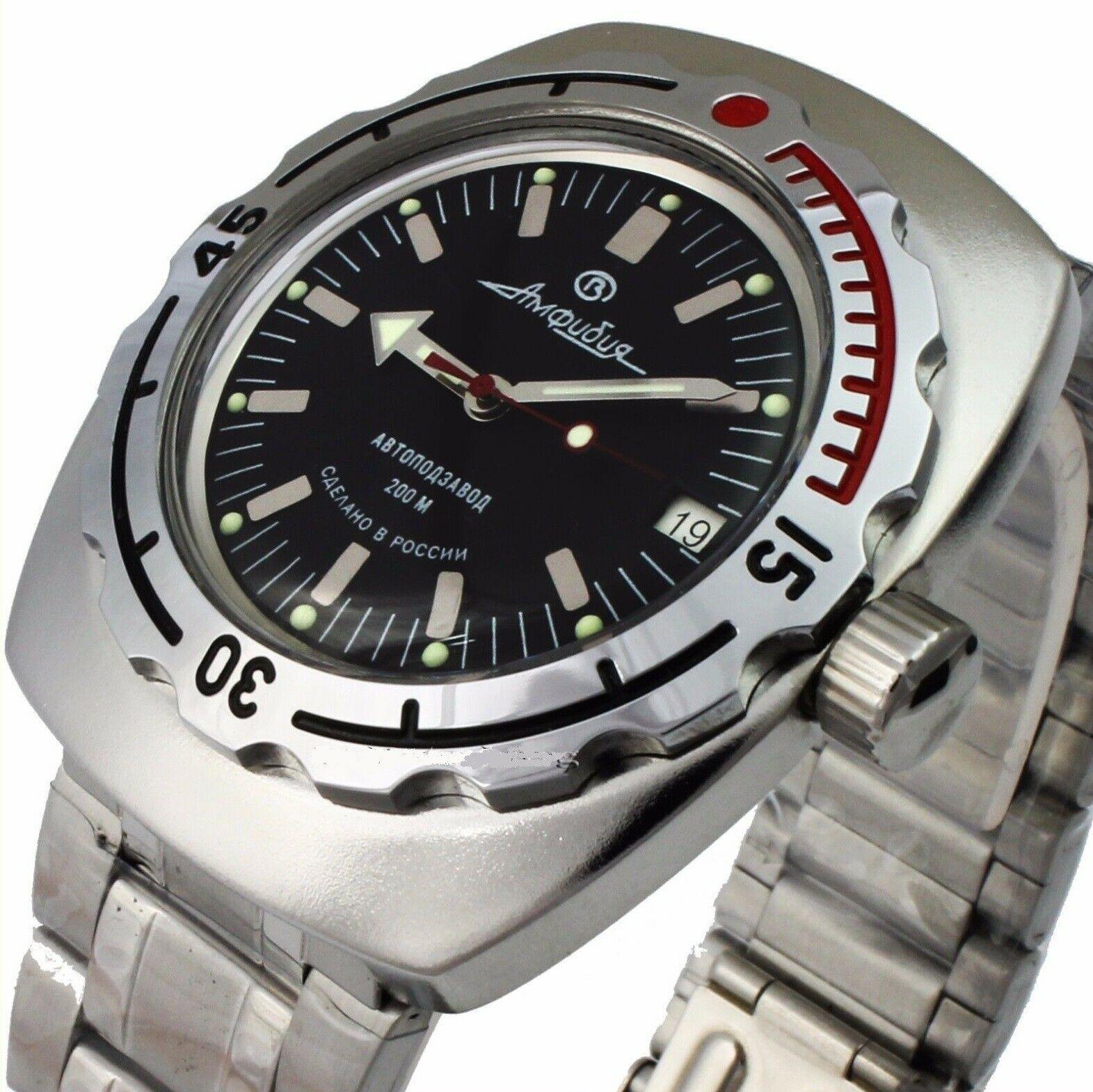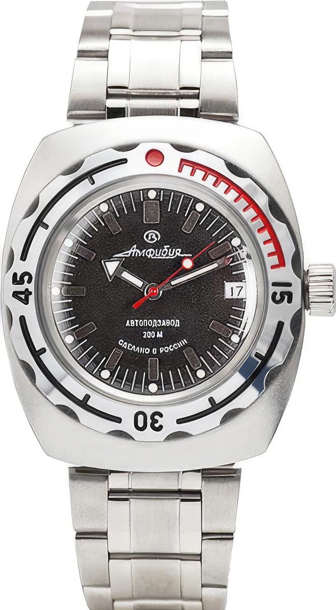 Мужские наручные часы Восток Амфибия 090662. Механические с автоподзаводом. Пружина механизма заводится автоматически благодаря естественным движениям владельца в процессе ежедневной носки часов. Корпус изготовлен из высококачественной нержавеющей стали 316L с высокими антикоррозийными свойствами. На стрелки и отметки нанесен светонакопительный состав, благодаря этому считывать информацию с циферблата возможно и в темноте. На циферблате отображается текущее число месяца. Браслет из нержавеющей стали. Органическое стекло. Часы являются водонепроницаемыми до 20 Бар. Цвет корпуса: Двухцветный. Цвет циферблата: Черный. Ширина (с заводной головкой): 41мм. Толщина: 13мм. Гарантия: 1 год.