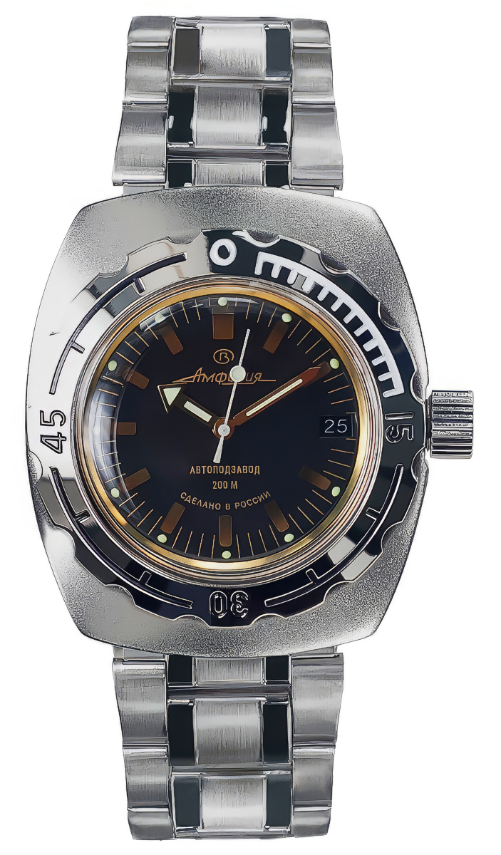 Мужские наручные часы Восток Амфибия 090679. Механические с автоподзаводом. Пружина механизма заводится автоматически благодаря естественным движениям владельца в процессе ежедневной носки часов. Корпус изготовлен из высококачественной нержавеющей стали 316L с высокими антикоррозийными свойствами. На стрелки и отметки нанесен светонакопительный состав, благодаря этому считывать информацию с циферблата возможно и в темноте. На циферблате отображается текущее число месяца. Браслет из нержавеющей стали. Органическое стекло. Часы являются водонепроницаемыми до 20 Бар. Цвет корпуса: Черный. Цвет циферблата: Черный. Ширина (с заводной головкой): 42мм. Толщина: 15мм. Гарантия: 1 год.