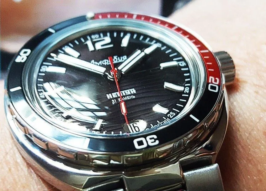 Мужские наручные часы Восток Амфибия 960760. Механические с автоподзаводом. Пружина механизма заводится автоматически благодаря естественным движениям владельца в процессе ежедневной носки часов. Корпус изготовлен из высококачественной нержавеющей стали 316L с высокими антикоррозийными свойствами. На стрелки и отметки нанесен светонакопительный состав, благодаря этому считывать информацию с циферблата возможно и в темноте. На циферблате отображается текущее число месяца. Браслет из нержавеющей стали. Органическое стекло. Часы являются водонепроницаемыми до 20 Бар. Цвет циферблата: Черный. Ширина (с заводной головкой): 40мм. Толщина: 15мм. Гарантия: 1 год.