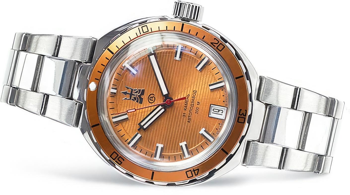 Мужские наручные часы Восток Амфибия 960895. Механические с ручным подзаводом. Корпус изготовлен из высококачественной нержавеющей стали 316L с высокими антикоррозийными свойствами. На стрелки и отметки нанесен светонакопительный состав, благодаря этому считывать информацию с циферблата возможно и в темноте. На циферблате отображается текущее число месяца. Браслет из нержавеющей стали. Органическое стекло. Часы являются водонепроницаемыми до 20 Бар. Цвет корпуса: Серебристый. Цвет циферблата: Оранжевый. Ширина (с заводной головкой): 38мм. Толщина: 12мм. Гарантия: 1 год.