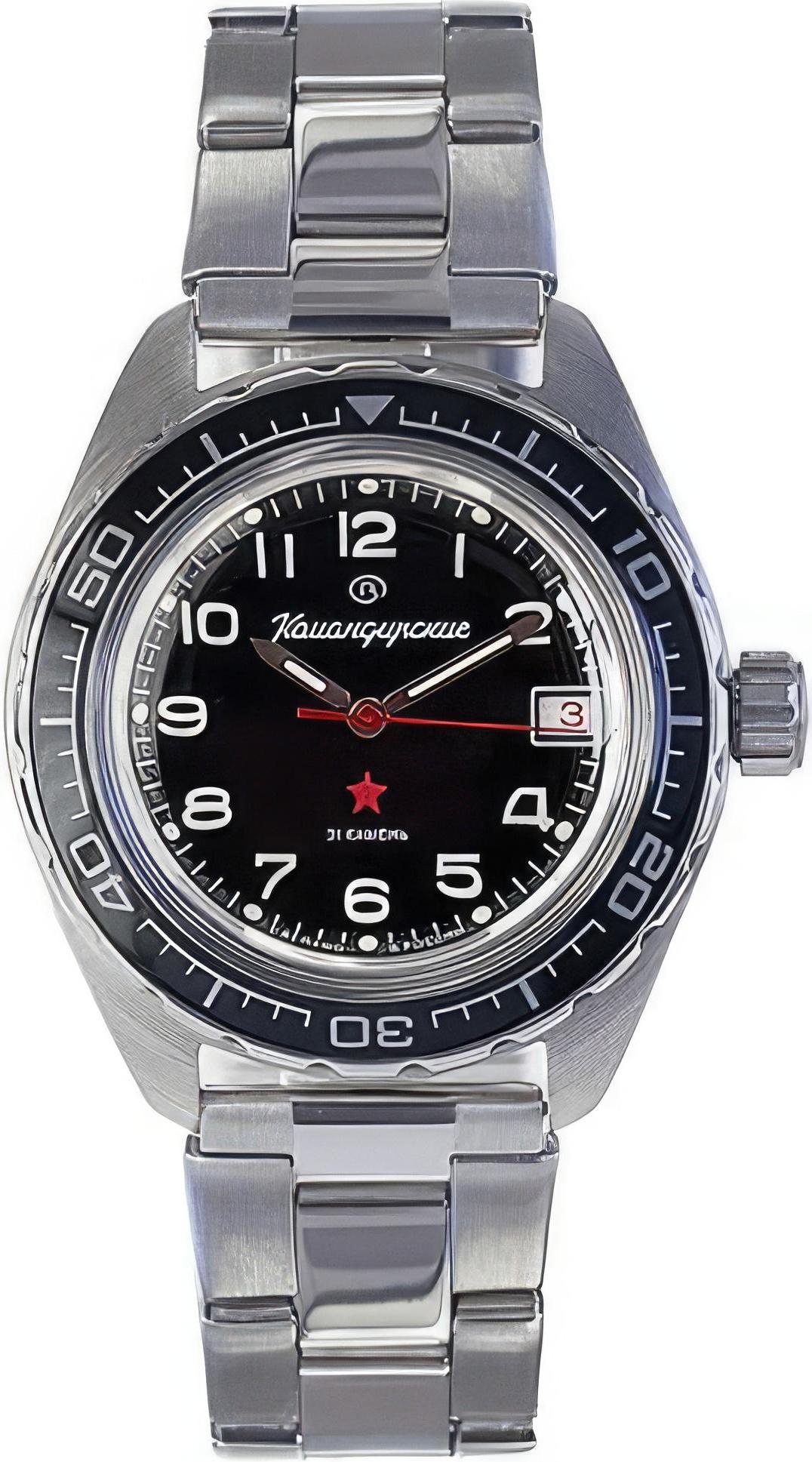 Мужские наручные часы Восток Командирские 020706. Механические с автоподзаводом. Пружина механизма заводится автоматически благодаря естественным движениям владельца в процессе ежедневной носки часов. Корпус изготовлен из высококачественной нержавеющей стали 316L с высокими антикоррозийными свойствами. На стрелки и отметки нанесен светонакопительный состав, благодаря этому считывать информацию с циферблата возможно и в темноте. На циферблате отображается текущее число месяца. Браслет из нержавеющей стали. Органическое стекло. Часы являются водонепроницаемыми до 20 Бар. Цвет циферблата: Черный. Ширина (с заводной головкой): 42мм. Толщина: 15мм. Гарантия: 1 год.