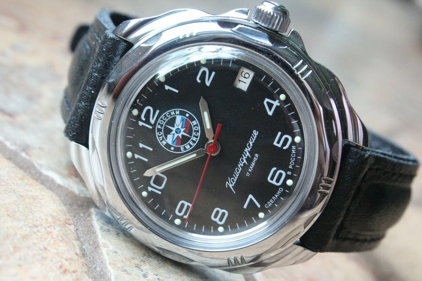 Мужские наручные часы Восток Командирские 211951. Механические с ручным подзаводом. Корпус изготовлен из высококачественной часовой латуни с высокими антикоррозийными свойствами. На стрелки и отметки нанесен светонакопительный состав, благодаря этому считывать информацию с циферблата возможно и в темноте. На циферблате отображается текущее число месяца. Ремешок изготовлен из кожи. Органическое стекло. Часы являются водонепроницаемыми до 10 Бар. Цвет циферблата: Черный. Ширина (с заводной головкой): 40мм. Толщина: 11мм. Гарантия: 1 год.