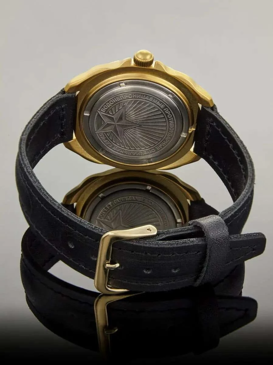 Мужские наручные часы Восток Командирские 21718Г. Механические с ручным подзаводом. Завод осуществляется через систему шестерней, передающих вращение с головки на заводной барабан. Механизм включает предохранительную систему, предотвращающую перезавод главной пружины.Ремешок изготовлен из кожи. Гибкость такого ремешка позволяет точно регулировать посадку часов на руке. Ударопрочная конструкция часов защищает от ударов и вибрации. Корпус изготовлен из высококачественной часовой латуни с высокими антикоррозийными свойствами. Органическое стекло. Часы являются водонепроницаемыми до 3 Бар. Цвет корпуса: Желтое золото. Цвет циферблата: Черный. Высота (с ушками): 44.4 мм. Толщина: 12 мм. Гарантия: 1 год.