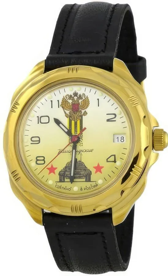 Мужские наручные часы Восток Командирские 219943. Механические с ручным подзаводом. Корпус изготовлен из высококачественной часовой латуни с высокими антикоррозийными свойствами. На стрелки и отметки нанесен светонакопительный состав, благодаря этому считывать информацию с циферблата возможно и в темноте. На циферблате отображается текущее число месяца. Ремешок изготовлен из кожи. Прочное, устойчивое к царапинам минеральное стекло защищает часы от повреждений.Часы являются водонепроницаемыми до 3 Бар. Цвет корпуса: Желтое золото. Цвет циферблата: Желтый. Ширина (с заводной головкой): 40мм. Толщина: 10мм. Гарантия: 1 год.