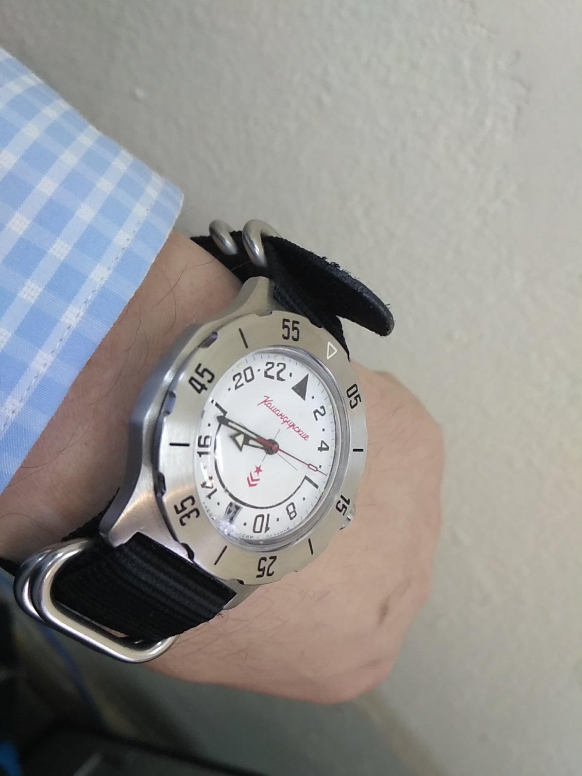 Мужские наручные часы Восток Командирские 350607. Автоматические с ручным подзаводом. Пружина механизма заводится автоматически благодаря естественным движениям владельца в процессе ежедневной носки часов. Также есть возможность ручного завода. Корпус изготовлен из высококачественной нержавеющей стали 316L с высокими антикоррозийными свойствами. На стрелки и отметки нанесен светонакопительный состав, благодаря этому считывать информацию с циферблата возможно и в темноте. На циферблате отображается текущее число месяца. Текстильный ремешок. Органическое стекло. Часы являются водонепроницаемыми до 10 Бар. Цвет корпуса: Двухцветный. Цвет циферблата: Белый. Ширина (с заводной головкой): 42мм. Толщина: 15мм. Гарантия: 1 год.
