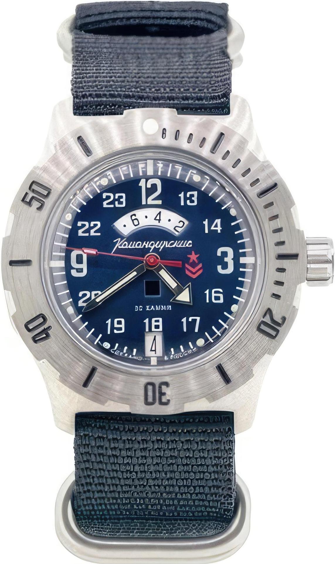 Мужские наручные часы Восток Командирские 350753. Автоматические с ручным подзаводом. Пружина механизма заводится автоматически благодаря естественным движениям владельца в процессе ежедневной носки часов. Также есть возможность ручного завода. Корпус изготовлен из высококачественной нержавеющей стали 316L с высокими антикоррозийными свойствами. На стрелки и отметки нанесен светонакопительный состав, благодаря этому считывать информацию с циферблата возможно и в темноте. На циферблате отображается текущее число месяца. Текстильный ремешок. Органическое стекло. Часы являются водонепроницаемыми до 10 Бар. Цвет корпуса: Двухцветный. Цвет циферблата: Синий. Ширина (с заводной головкой): 42мм. Толщина: 15мм. Гарантия: 1 год.