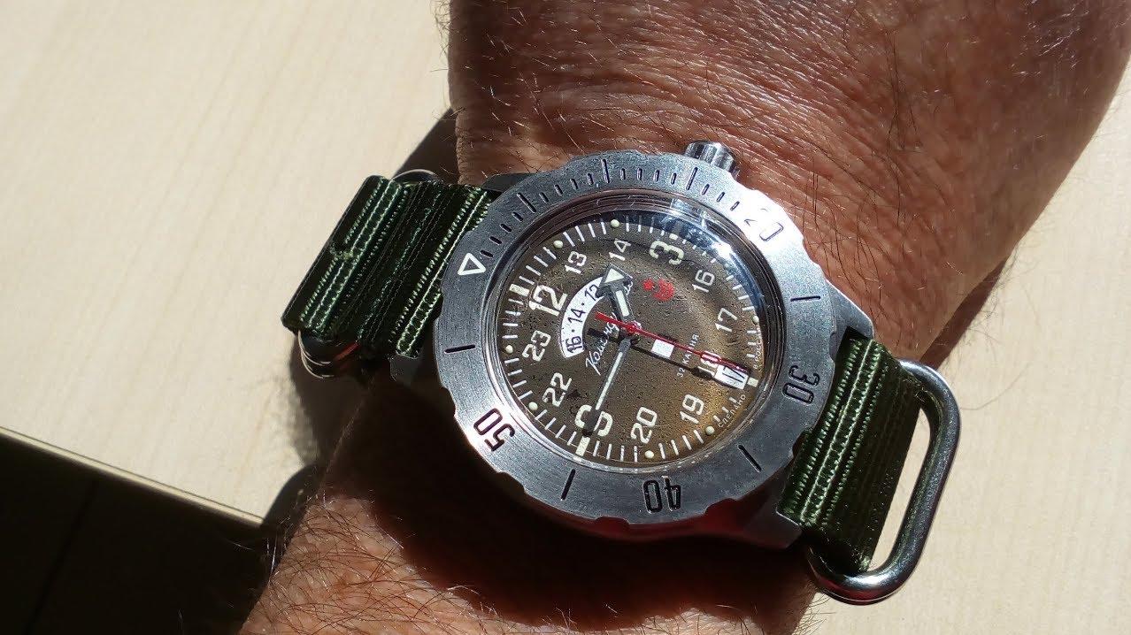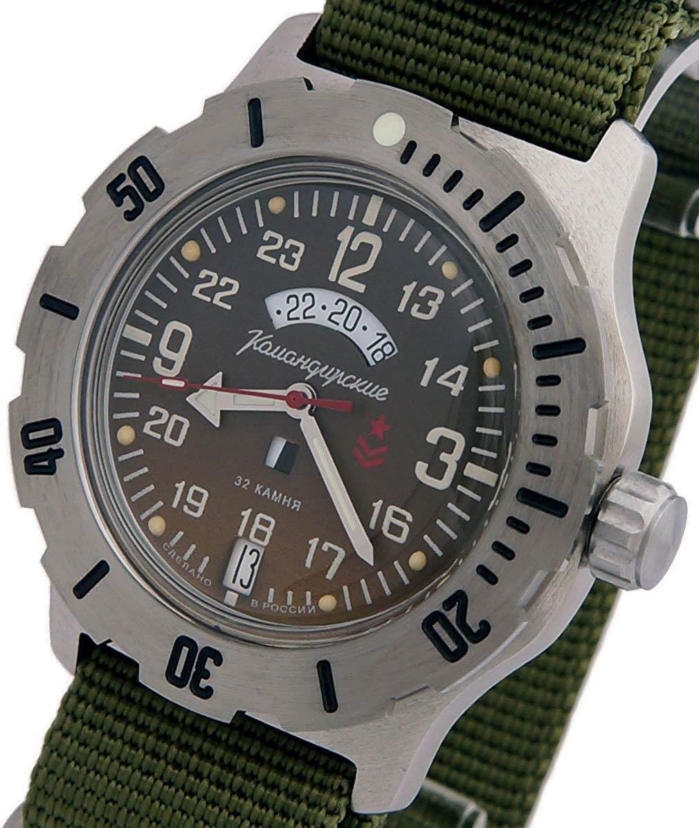 Мужские наручные часы Восток Командирские 350754. Автоматические с ручным подзаводом. Пружина механизма заводится автоматически благодаря естественным движениям владельца в процессе ежедневной носки часов. Также есть возможность ручного завода. Корпус изготовлен из высококачественной нержавеющей стали 316L с высокими антикоррозийными свойствами. На стрелки и отметки нанесен светонакопительный состав, благодаря этому считывать информацию с циферблата возможно и в темноте. На циферблате отображается текущее число месяца. Текстильный ремешок. Органическое стекло. Часы являются водонепроницаемыми до 10 Бар. Цвет корпуса: Двухцветный. Цвет циферблата: Коричневый. Ширина (с заводной головкой): 42мм. Толщина: 15мм. Гарантия: 1 год.