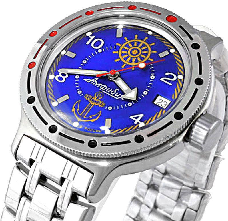 Мужские наручные часы Восток Командирские 420374. Автоматические с ручным подзаводом. Пружина механизма заводится автоматически благодаря естественным движениям владельца в процессе ежедневной носки часов. Также есть возможность ручного завода. Корпус изготовлен из высококачественной нержавеющей стали 316L с высокими антикоррозийными свойствами. На стрелки и отметки нанесен светонакопительный состав, благодаря этому считывать информацию с циферблата возможно и в темноте. На циферблате отображается текущее число месяца. Браслет из нержавеющей стали. Органическое стекло. Часы являются водонепроницаемыми до 20 Бар. Цвет корпуса: Серебристый. Цвет циферблата: Синий. Ширина (с заводной головкой): 40мм. Толщина: 13мм. Гарантия: 1 год.