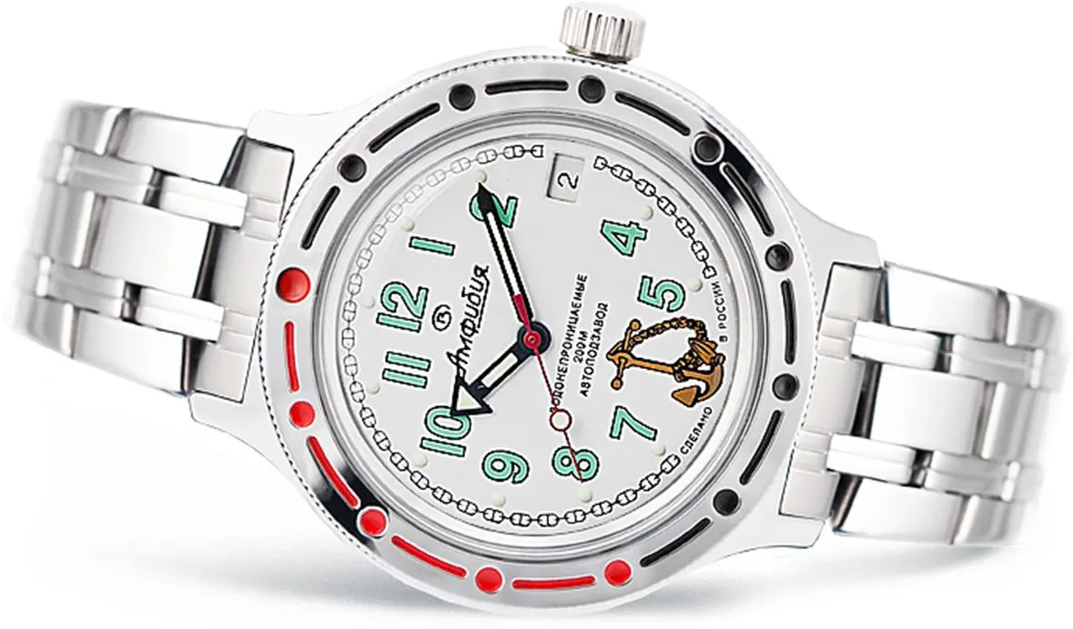 Мужские наручные часы Восток Командирские 420381. Автоматические с ручным подзаводом. Пружина механизма заводится автоматически благодаря естественным движениям владельца в процессе ежедневной носки часов. Также есть возможность ручного завода. Корпус изготовлен из высококачественной нержавеющей стали 316L с высокими антикоррозийными свойствами. На стрелки и отметки нанесен светонакопительный состав, благодаря этому считывать информацию с циферблата возможно и в темноте. На циферблате отображается текущее число месяца. Браслет из нержавеющей стали. Органическое стекло. Часы являются водонепроницаемыми до 20 Бар. Цвет корпуса: Серебристый. Цвет циферблата: Белый. Ширина (с заводной головкой): 42мм. Толщина: 15мм. Гарантия: 1 год.