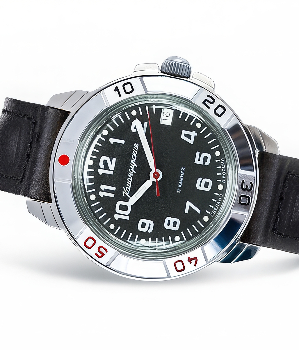 Мужские наручные часы Восток Командирские 43184Б. Механические с ручным подзаводом. Ремешок изготовлен из кожи. Латунный браслет. Органическое стекло. На циферблате отображается текущее число месяца. Часы являются водонепроницаемыми до 3 Бар. Цвет циферблата: Серебристый. Цвет корпуса: Черный. На стрелки и отметки нанесен светонакопительный состав, благодаря этому считывать информацию с циферблата возможно и в темноте. Толщина: 12 мм. Гарантия: 1 год.