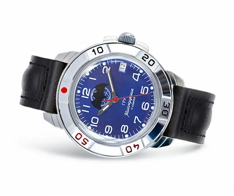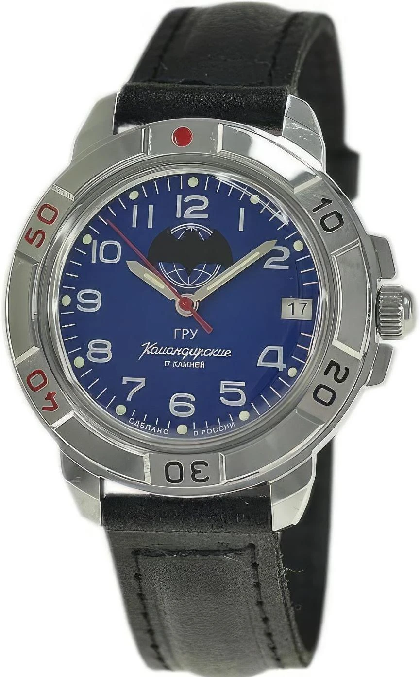 Мужские наручные часы Восток Командирские 431874. Механические с ручным подзаводом. Корпус изготовлен из высококачественной нержавеющей стали 316L с высокими антикоррозийными свойствами. На стрелки и отметки нанесен светонакопительный состав, благодаря этому считывать информацию с циферблата возможно и в темноте. На циферблате отображается текущее число месяца. Ремешок изготовлен из кожи. Прочное, устойчивое к царапинам органическое стекло защищает часы от повреждений. Часы являются водонепроницаемыми до 3 Бар. Цвет корпуса: Серебристый. Цвет циферблата: Синий. Ширина (с заводной головкой): 42мм. Толщина: 15мм. Гарантия: 1 год.