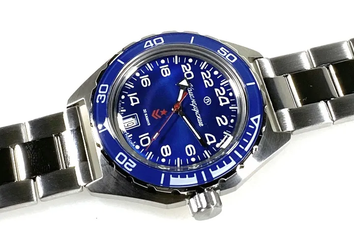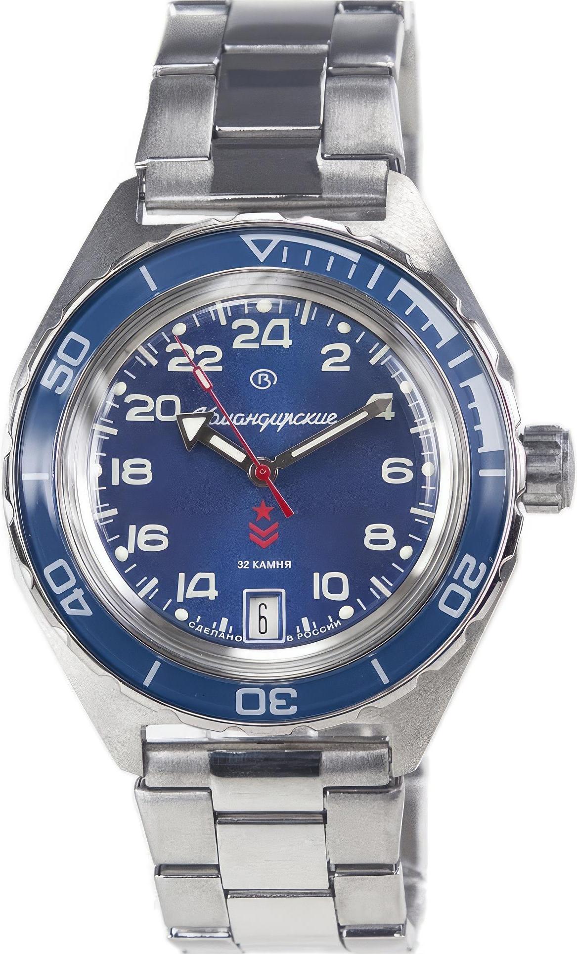 Мужские наручные часы Восток Командирские 650547. Механические с автоподзаводом. Пружина механизма заводится автоматически благодаря естественным движениям владельца в процессе ежедневной носки часов. Корпус изготовлен из высококачественной нержавеющей стали 316L с высокими антикоррозийными свойствами. На стрелки и отметки нанесен светонакопительный состав, благодаря этому считывать информацию с циферблата возможно и в темноте. На циферблате отображается текущее число месяца. Браслет из нержавеющей стали. Органическое стекло. Часы являются водонепроницаемыми до 10 Бар. Цвет корпуса: Синий. Цвет циферблата: Синий. Ширина (с заводной головкой): 43мм. Толщина: 15мм. Гарантия: 1 год.