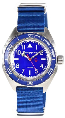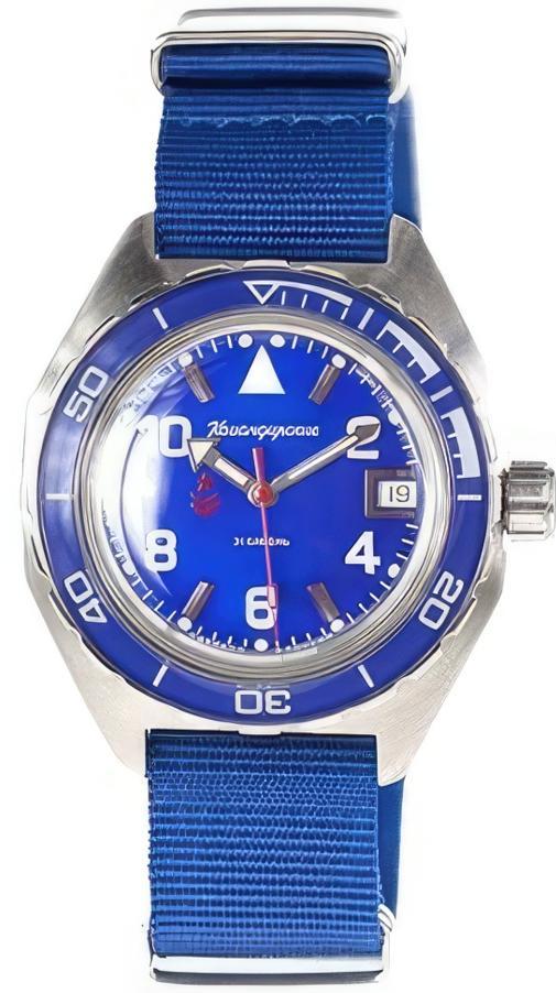 Мужские наручные часы Восток Командирские 650853. Механические с автоподзаводом. Пружина механизма заводится автоматически благодаря естественным движениям владельца в процессе ежедневной носки часов. Корпус изготовлен из высококачественной нержавеющей стали 316L с высокими антикоррозийными свойствами. На стрелки и отметки нанесен светонакопительный состав, благодаря этому считывать информацию с циферблата возможно и в темноте. На циферблате отображается текущее число месяца. Текстильный ремешок. Органическое стекло. Часы являются водонепроницаемыми до 20 Бар. Цвет корпуса: Синий. Цвет циферблата: Синий. Ширина (с заводной головкой): 46мм. Толщина: 15мм. Гарантия: 1 год.