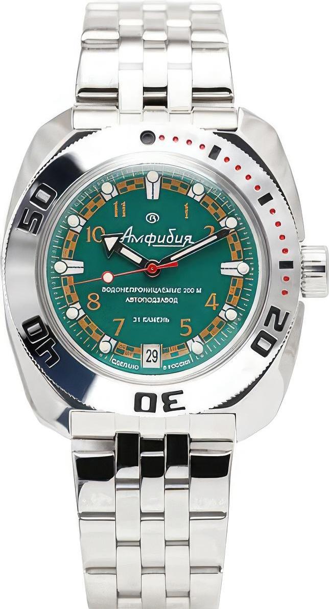 Мужские наручные часы Восток Командирские 710439. Автоматические с ручным подзаводом. Пружина механизма заводится автоматически благодаря естественным движениям владельца в процессе ежедневной носки часов. Также есть возможность ручного завода. Корпус изготовлен из высококачественной нержавеющей стали 316L с высокими антикоррозийными свойствами. На стрелки и отметки нанесен светонакопительный состав, благодаря этому считывать информацию с циферблата возможно и в темноте. На циферблате отображается текущее число месяца. Браслет из нержавеющей стали. Органическое стекло. Часы являются водонепроницаемыми до 20 Бар. Цвет корпуса: Зеленый. Цвет циферблата: Зеленый. Ширина (с заводной головкой): 42мм. Толщина: 12мм. Гарантия: 1 год.