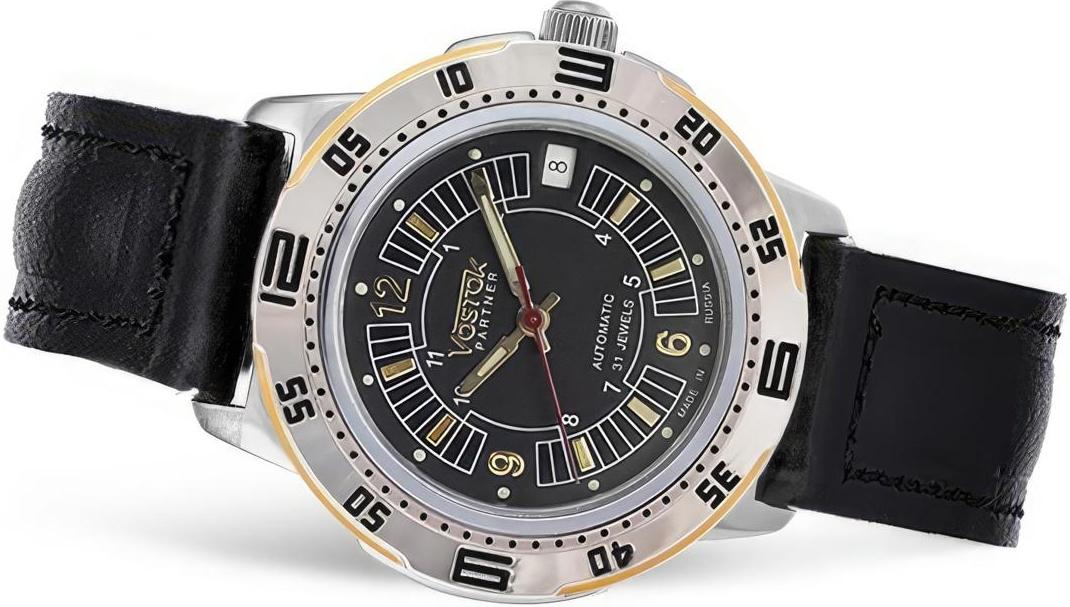 Мужские наручные часы Восток Партнер 31160А. Механические с ручным подзаводом. Ремешок изготовлен из кожи. Браслет из нержавеющей стали. Прочное, устойчивое к царапинам минеральное стекло защищает часы от повреждений. На циферблате отображается текущее число месяца. Часы являются водонепроницаемыми до 3 Бар. Цвет циферблата: Серебристый. Цвет циферблата: Желтое золото. Цвет корпуса: Черный. На стрелки и отметки нанесен светонакопительный состав, благодаря этому считывать информацию с циферблата возможно и в темноте. Толщина: 14 мм. Гарантия: 1 год.